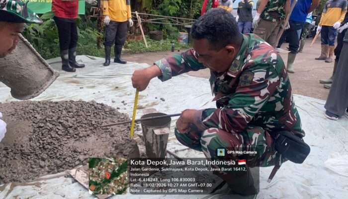 www.mediasurabayanews.com, DEPOK – Pelaksanaan TNI Manunggal Membangun Desa (TMMD) Ke-127 Tahun Anggaran 2026 oleh Kodim 0508/Depok memasuki hari ke-8, Rabu (18/02/2026), dengan progres signifikan pada sasaran fisik pengerasan jalan di kawasan GDC Sektor Gardenia, Blok Q RT 03/07, Kelurahan Tirtajaya, Kecamatan Sukmajaya, Kota Depok.