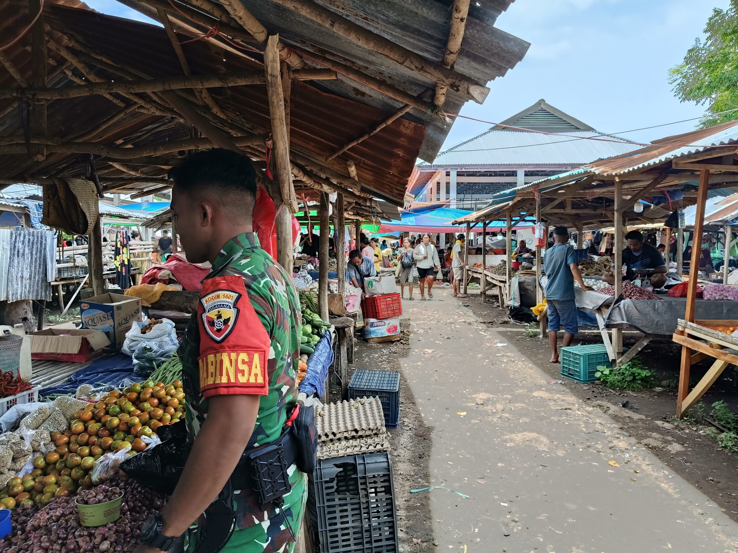 www.mediasurabayanews.com, NTT (SUMBA TIMUR) – Dalam rangka menjaga stabilitas harga bahan pokok serta menciptakan lingkungan pasar yang bersih dan nyaman menjelang bulan suci Ramadhan, Babinsa Koramil 02/Rindi Umalulu jajaran Kodim 1601/Sumba Timur, Pratu Dendi Djami turun langsung ke Pasar Tradisional Melolo, Kecamatan Umalulu, Kabupaten Sumba Timur, pada Kamis (19/02/26).