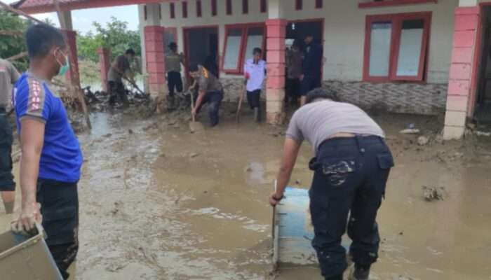 Kadinkes Bersama Polres Bireuen Gelar Gotong Royong Bersihkan Pustu Alue Kuta Pascabanjir