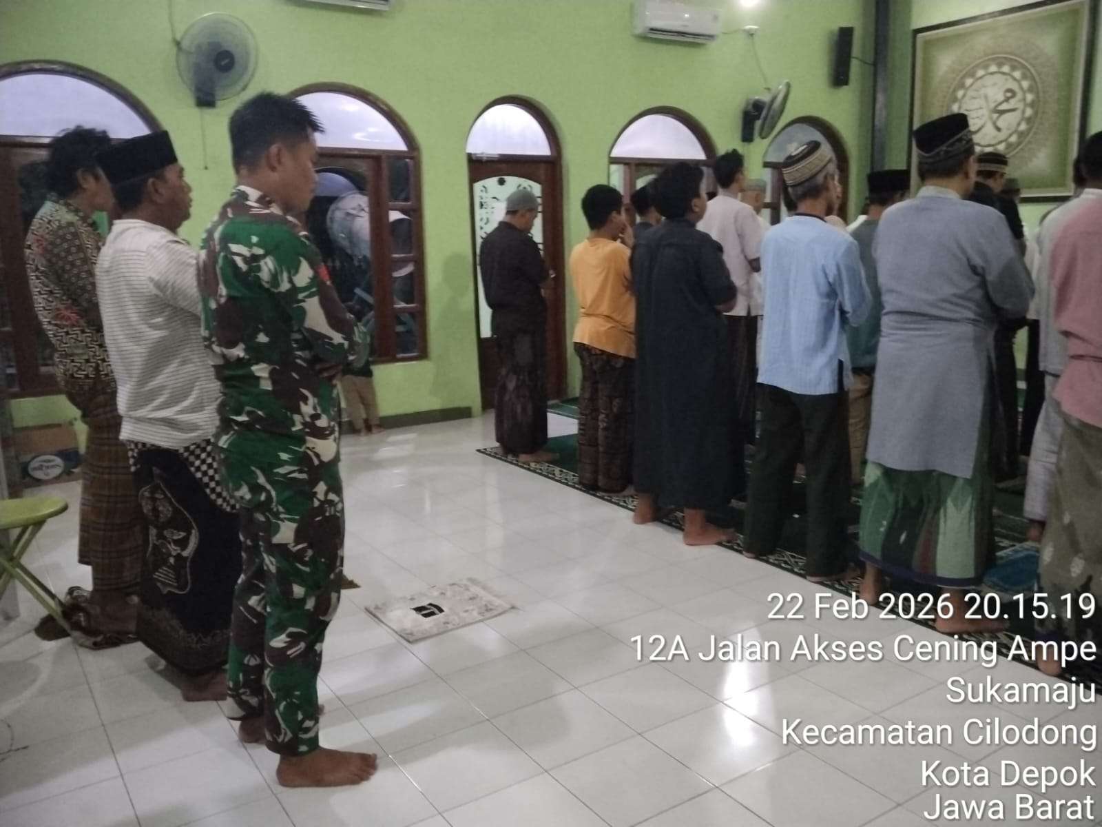 Memasuki hari ke-13, pada Senin (23/02/2026), Satgas TMMD melaksanakan shalat tarawih bersama warga di Masjid Baitul Rahim, Kelurahan Sukamaju, Kecamatan Cilodong, Kota Depok.