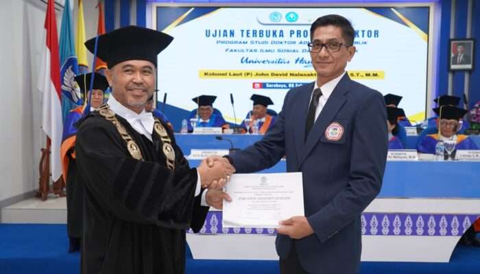 MSN-Surabaya – Program Doktoral Administrasi Publik Fakultas Ilmu Sosial dan Ilmu Politik (FISIP) Universitas Hang Tuah (UHT) kembali mencetak lulusan doktor. John David Nalasakti Sondakh, S.T., M.M. resmi meraih gelar Doktor Administrasi Publik setelah menjalani sidang disertasi pada Minggu (8/2/2026) di Gedung Pascasarjana Universitas Hang Tuah lantai 5.