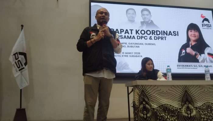 www.mediasurabayanews.com, SURABAYA – Partai Solidaritas Indonesia (PSI) Kota Surabaya menggelar Rapat koordinasi bersama pengurus dan pengurus ranting se-Surabaya, yang berlokasi di Hotel KYRIE, Jalan Ciliwung, pada Senin (16/03/2026, pukul 19.00 WIB.Dalam acara Rapat Koordinasi pada Senin 16 Maret 2026 ini, yang dihadiri oleh 5 (Lima) DPC dan DPRT dari masing masing 5 DPC, diantaranya DPC Gubeng, DPC Semampir, DPC Genteng, DPC Bubutan, dan DPC Gayungan, sedang DPC lainnya menunggu untuk Koordinasi berikutnya.Kegiatan ini menjadi bagian dari upaya konsolidasi internal partai dalam memperkuat Struktur Organisasi hingga tingkat akar rumput. Rapat yang digelar di Hotel KYRIE, Jalan Ciliwung, Kota Surabaya, Jawa Timur, tersebut dihadiri Ketua DPD PSI Surabaya, Grace Evi Ekawati, SE., SH., MHum,. Sekertaris DPD Surabaya, William Wirakusuma, ST., M.Sc., Bendahara DPD Surabaya, Sis Nia, dan bersama jajaran pengurus 5 DPC (Gubeng, Gayungan, Bubutan, Genteng, dan Semampir) serta pengurus ranting dari berbagai 5 kecamatan yang diundang.Dalam sambutannya, Ketua DPD PSI Surabaya, Grace Evi Ekawati, SE., SH., MHum,., menyampaikkan rasa terimakasih kepada semua pengurus DPC dan DPRT yang hadir di acara ini, meski banyak para pengurus disibukkan dengan acara mereka sudah berkenan hadir di acara ini, demi memperkuat silaturahmi dan memperkuat struktur organisasi di PSI Kota Surabaya.“Penting bagi kita untuk membangun struktur kepengurusan yang kuat dan solid, mulai dari tingkat Pusat, Provinsi, Kota/kabupaten, Kecamatan hingga ke Kelurahan, dan tidak ada lagi saling menjatuhkan dan pertentangan, mari kita perkuat internal kita, bukan saling menjatuhkan, musuh kita bukan teman kita sendiri, musuh kita ada diluar sana, mari kita jaga dan saling mempererat didalam struktur Partai PSI ini, saya juga sudah mempersiapkan untuk Kantor DPD PSI di tengah Kota, serta kita akan memiliki mobil Ambulance yang nantinya bisa kita pergunakan apa bila ada yang membutuhkan, saya sebagai Mama nya kalian siap membantu dan berjuang untuk Partai kita tercinta PSI,” ujar Mama Evi sapaan akrab beliau..Menurutnya, penguatan struktur organisasi merupakan bagian dari persiapan menghadapi dinamika Politik Nasional ke depan, termasuk menyongsong agenda politik pada 2028, mari kita harus bisa menambah kursi di Kota Surabaya ini.Ia menyebutkan, PSI membuka ruang bagi berbagai tokoh masyarakat, kaula muda dan kader potensial yang ingin berkontribusi melalui partai PSI, termasuk dalam kontestasi legislatif di masa mendatang.Dalam hal ini Sekertaris DPD Kota Surabaya, William Wirakusuma, ST., M.Sc., juga menyampaikan, bahwa Rapat koordinasi ini juga dimanfaatkan untuk mempererat antara DPD dan DPC serta DPRT, serta bisa secara langsung menyampaikkan apa kendala yang dihadapi di daerah masing masing. Serta mengevaluasi sejumlah kegiatan yang telah berjalan sekaligus menyusun program kerja ke depan.Selain forum membahas Struktur yang sudah terbentuk juga menjadi momentum mempererat kebersamaan antar kader. Suasana keakraban semakin terasa saat Ketua DPD Surabaya, Mama Evi memberikan game pertanyaan dengan berbagai hadia menarik, serta dilanjut dengan beberapa perwakilan DPRT maju kedepan dengan berjoget bersama….hal ini menambah suasana penuh keakraban.Melalui rapat koordinasi tersebut, para peserta berharap sinergi antar pengurus PSI di Kota Surabaya semakin kuat sehingga mampu menjalankan berbagai program organisasi secara lebih efektif serta memberikan kontribusi nyata bagi masyarakat.Kemudian acara dilanjut dengan Foto bersama dengan seluruh pengurus DPD, DPC serta DPRT. (Satriya)* Post Views: 688 Navigasi posH. Ruslan Daud Gelar Buka Puasa Bersama Wartawan Bireuen