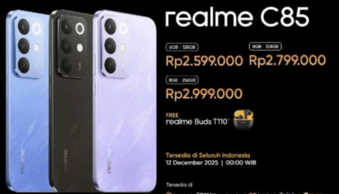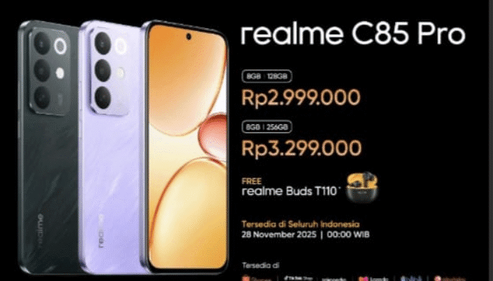 Dapatkan bonus realme Buds T110 secara gratis* untuk setiap pembelian realme C85 Pro selama periode awal penjualan. Penawaran online ini mulai tersedia pada 28 November 2025 pukul 00:00 WIB, dan dapat diperoleh melalui beragam platform ecommerce populer.