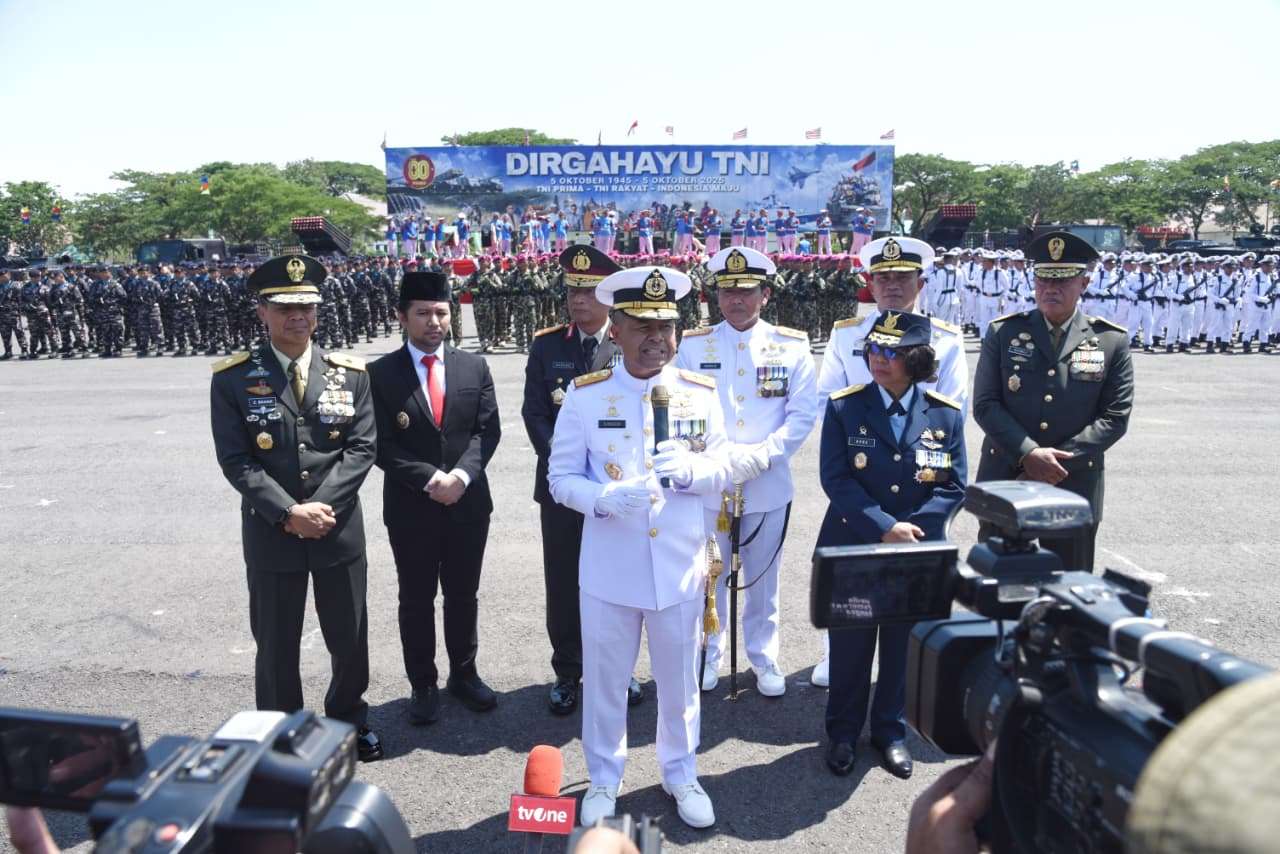 www.mediasurabayanews.com, Surabaya – Dalam rangka memperingati Hari Ulang Tahun ke-80 Tentara Nasional Indonesia (TNI), dilaksanakan upacara militer di Lapangan Sutedi Senaputra Karang Pilang, Surabaya, dengan tema TNI Prima -TNI Rakyat- Indonesia Maju, Inspektur Upacara Wakil Komandan Komando Pembinaan Doktrin, Pendidikan dan Latihan TNI Angkatan Laut (Wadan Kodiklatal). Laksda TNI Singgih Sugiarto, S.T.,M.Si. sebagai Komandan Upacara Letkol Czi Hery Kisyanto, S.Hub.Int (Dandenzibang 3/V Madiun) dan Perwira Upacara Letkol Inf Prasetya Hari Karyawan, S.H., M.H. (Kaprot Kogartap III/Sby). pada Minggu (05/10/2025).