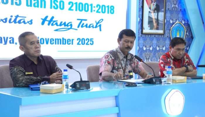 Audit yang berlangsung sejak 18–20 November 2025 berjalan lancar. Dalam penyampaiannya, Lead Auditor Mr. Muhammad Rudyanto Arief, M.T. menegaskan bahwa Universitas Hang Tuah telah memenuhi seluruh persyaratan standar ISO 9001:2015 (Sistem Manajemen Mutu) dan ISO 21001:2018 (Sistem Manajemen Organisasi Pendidikan). Meski terdapat beberapa temuan yang perlu ditindaklanjuti, keseluruhan sistem dinilai telah berjalan sesuai standar internasional.